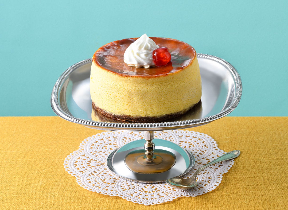 見た目はまるでプリンアラモード!オーストラリア産クリームチーズのスフレ生地の中にジャージー牛乳を使用したなめらかなカスタードクリームを入れて焼き上げたカスタードプリン風のチーズケーキです。