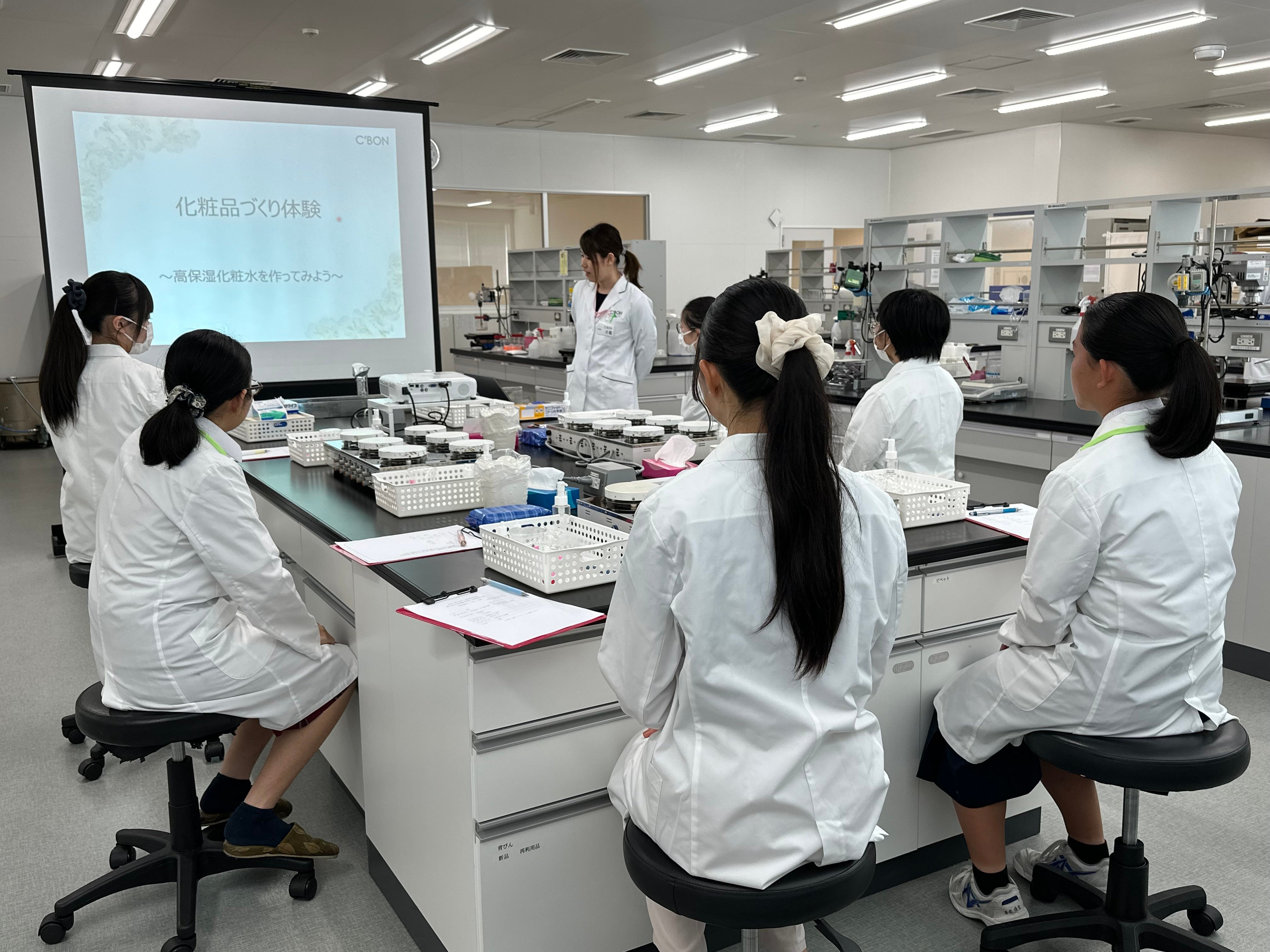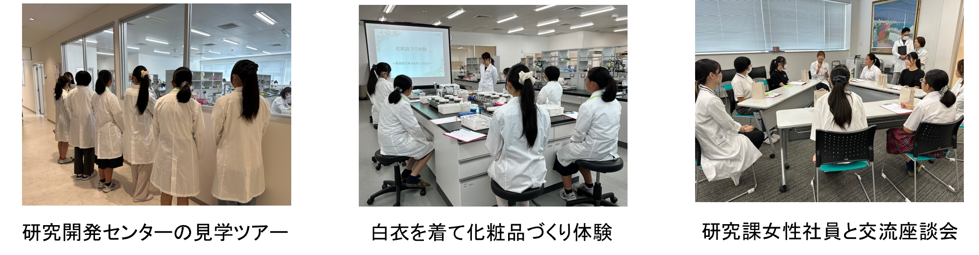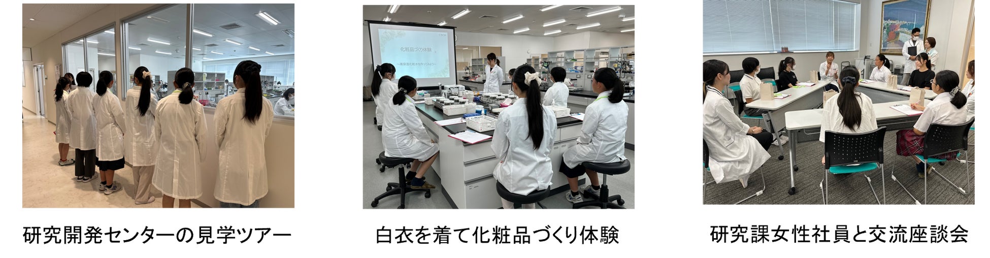 【プログラム】 化粧品の研究開発の現場見学と実験、化粧品づくり体験、女性社員との交流会