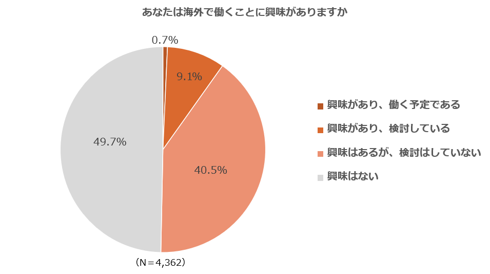 海外で働くことに興味があると回答した学生は全体の約5割(50.3%)という結果になりました。実際に働く予定がある学生、海外就業を検討している学生は約10人に1人(9.8%)という結果になりました。