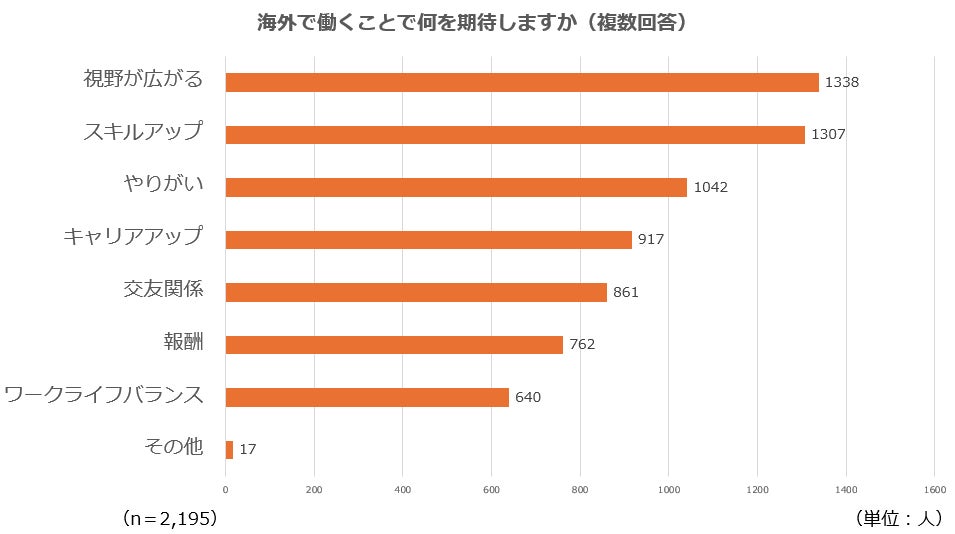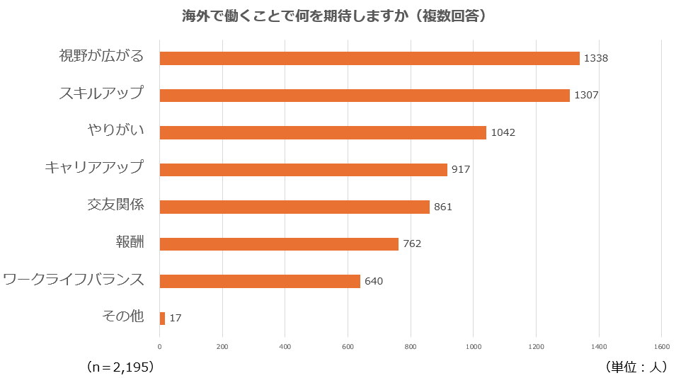 ・海外就労で期待することで最も多い回答は「視野が広がる」次いで「スキルアップ」