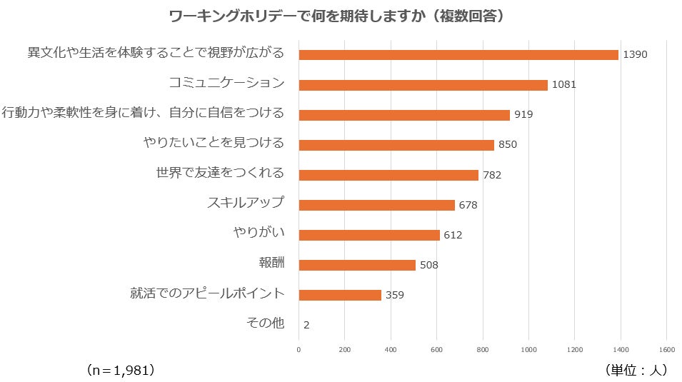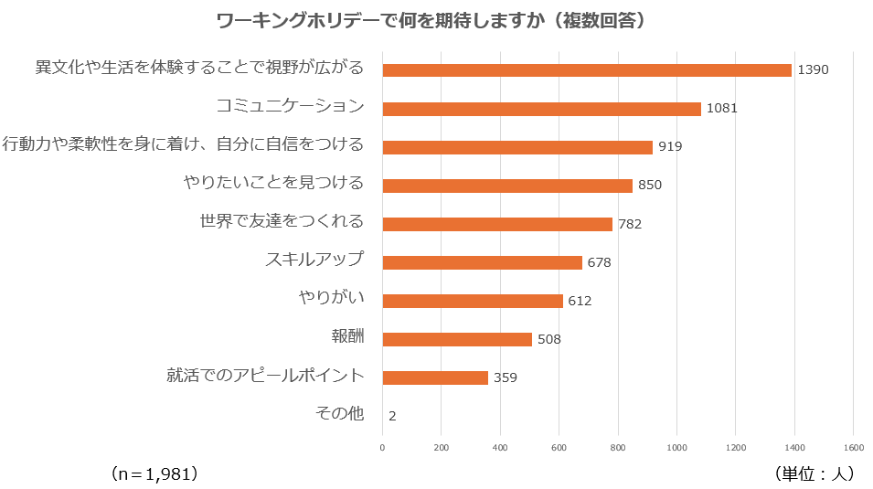 ワーキングホリデーに興味があると回答した学生に期待することを尋ねたところ、最も多い回答は「異文化や生活を体験することで視野が広がる」、次いで「コミュニケーション」「行動力や柔軟性を身に着け、自分に自信をつける」という結果になりました。