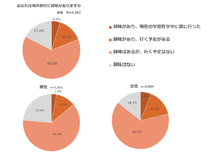 海外旅行については、約8割(76.4%)の学生が海外旅行に興味があると回答。男女別で集計したところ、「興味なしと」回答した学生は、男性が約2割(23.6%)、女性が約1割(14.2%)と性別によって差が出ることがわかりました。