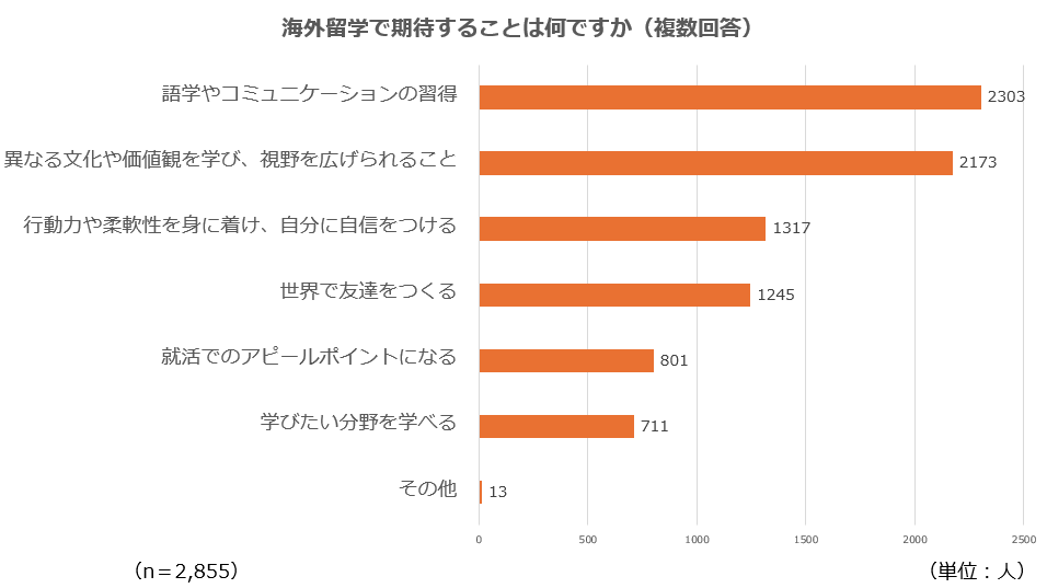 ・海外留学で期待することとして最も多いものは「語学やコミュニケーションの習得」