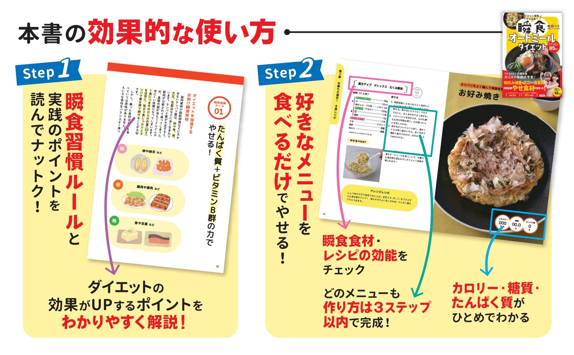 本書で紹介するレシピはすべて調理工程が3ステップ以内。レンチンするだけ、混ぜるだけで完成するレシピも豊富なのでずぼらでも続けられます。それぞれのレシピには、脂肪燃焼やむくみ解消など、期待できる美容効果を記載。食べたいメニューに悩んだらお悩みに合わせてレシピを選ぶのもおすすめです。