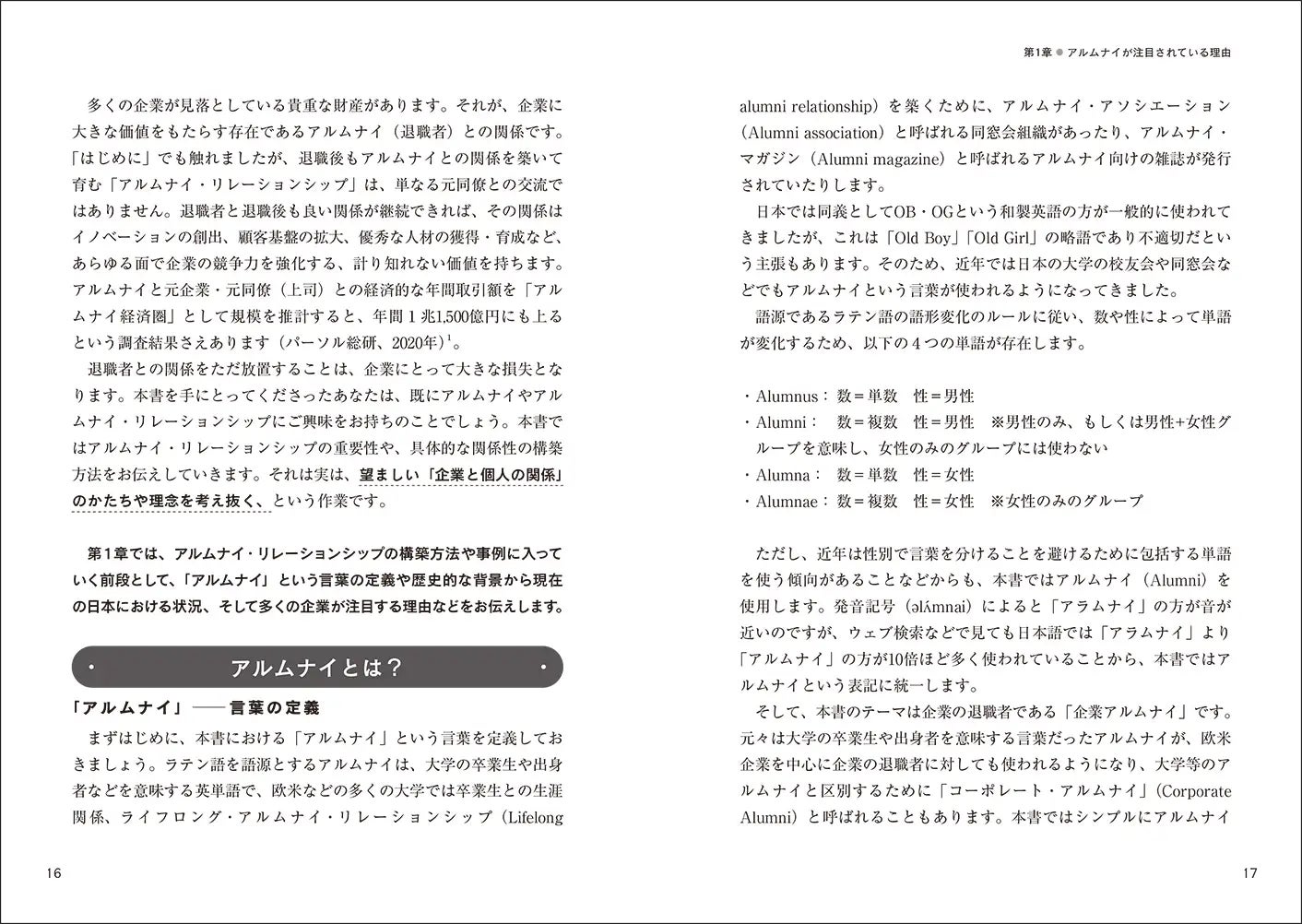 本書籍は、そんな「アルムナイ」を主題とした日本で初めての書籍*です。「アルムナイ」と企業の関係構築が双方にどんな意味を持ち、どのように関係性構築(「アルムナイ・リレーションシップ」)を進めていくべきなのか、詳しく説明します。アルムナイと良い関係性を構築・維持する具体的な方法、退職で終わらない「企業と個人の新しい関係」の実現のステップを学ぶことで、「退職による損失がない社会の実現」に向けた一歩を、一緒に踏み出しませんか。