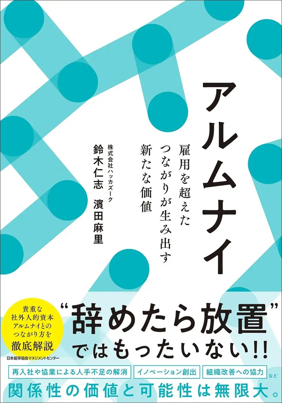 アルムナイ(退職者)専門サービス『Official-Alumni.com』を提供する株式会社ハッカズーク(本社:東京都、代表取締役CEO:鈴木仁志「以下ハッカズーク」)は、2024年10月1日(火)に代表の鈴木 仁志とアルムナイ・リレーションシップ・パートナー ユニットリーダーの濱田 麻里が執筆した、新刊『アルムナイ 雇用を超えたつながりが生み出す新たな価値』が株式会社日本能率協会マネジメントセンター(代表取締役社長:張 士洛、東京都中央区、以下JMAM[ジェイマム])より発売されたことをお知らせいたします。本書は、企業価値向上に向けて、経営層や人事担当者を主な対象とした、企業と退職者との関係構築のための、日本初*の「アルムナイ・リレーションシップ」実践書です。