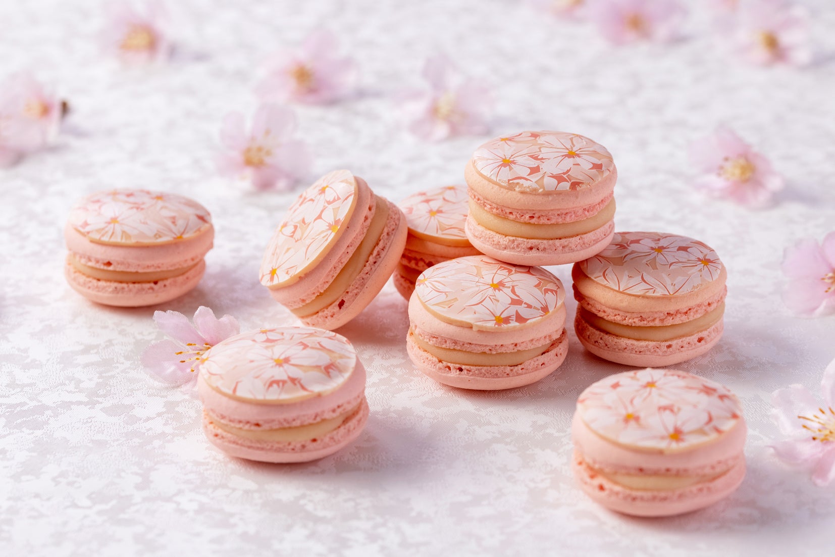上品な桜色の可愛らしいマカロンに、桜模様のチョコレートをコーティングしたマカロンは、季節の手土産にも最適です。