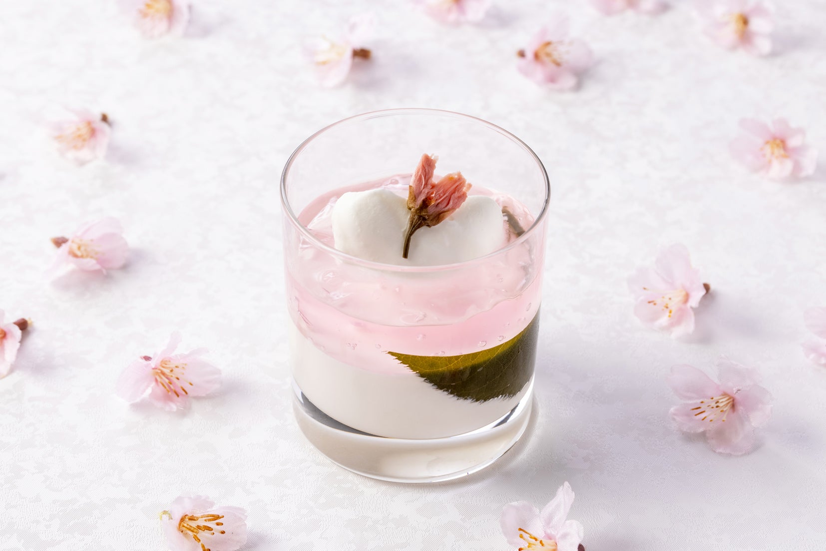 桜風味のパンナコッタの上に桜のゼリーを重ねた見た目も華やかなグラススイーツは、トップにホイップクリームと塩漬けした桜の花びらが飾られています。