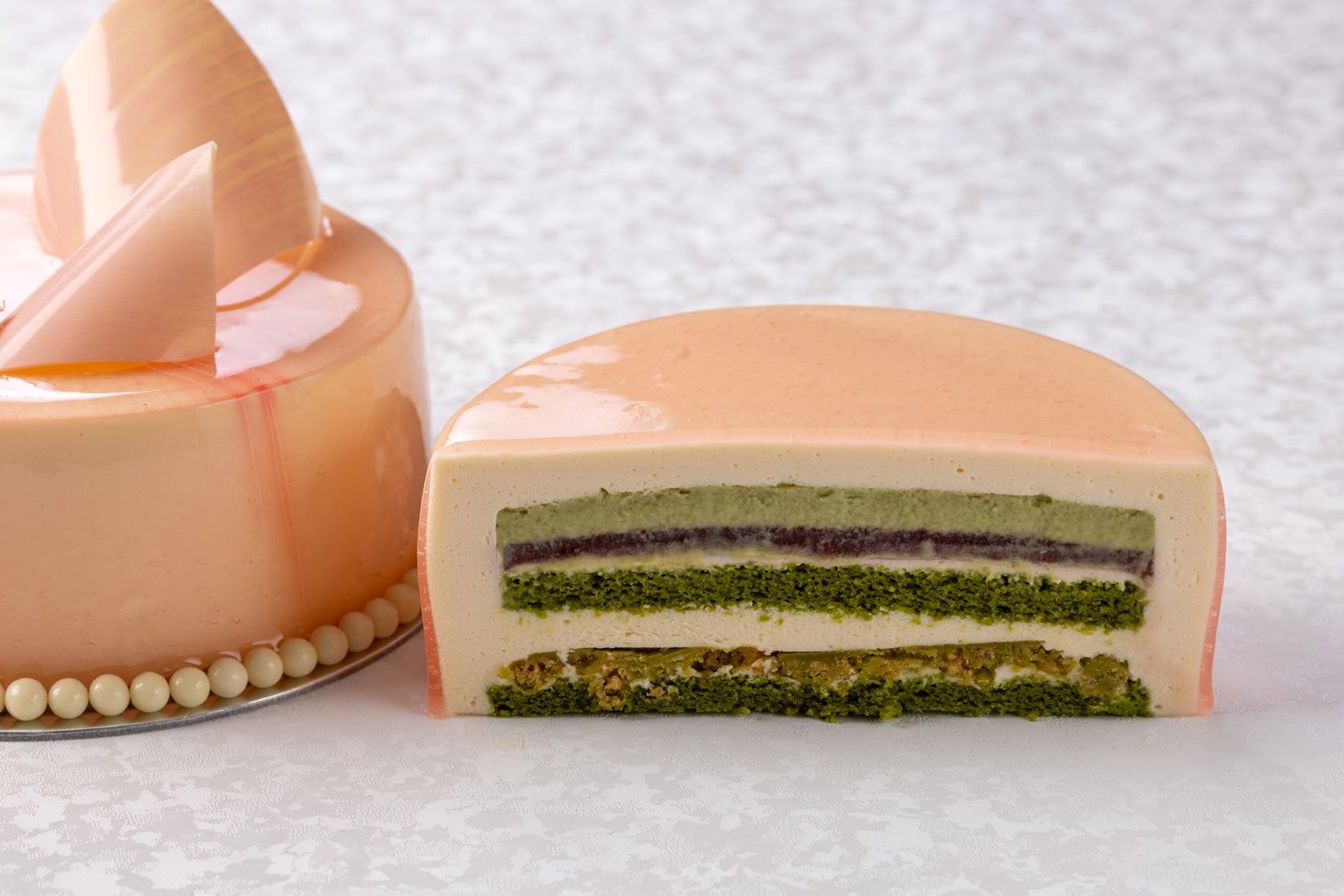 抹茶のスポンジ生地に食感のアクセントとなる抹茶クランブル、桜とホワイトチョコレートのムースや桜と苺のブリュレ、抹茶のブリュレを重ねて、全体をしっとりとした桜とホワイトチョコレートのムースで覆った新作ケーキです。優しい桜の味と抹茶のほのかな苦み、ホワイトチョコレートの味わいが口の中でハーモニーを奏でる、甘いスイーツがあまり得意ではないお客様にもおすすめの一品です。