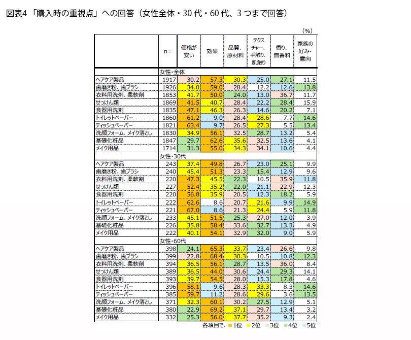 次に、各品目の購入に際してなにを重視しているのかについて、女性全体と30代・60代で見てみましょう(図表4)。女性全体では紙類(トイレットペーパー等)とせっけん類、食器用洗剤で「価格が安い」がトップに。消費量が多い品目では“安さ”を重視する、ということでしょうか。一方で化粧品類やヘアケア製品、口腔ケア用品、衣料用洗剤といった肌に直接つけたり口に含んだりする項目では「効果」が首位となりました。せっけん類や台所用洗剤では1位「価格」と2位「効果」の差はほとんどなく、両者のバランスを考えて購入しているということでしょうか。化粧品類とヘアケア製品では、「品質、原材料」が2位、また、紙類では「テクスチャ―、手触り、肌触り」が2位となっているのは納得できますね。