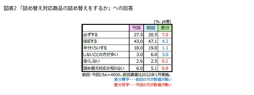 詰め替え対応商品の利用状況についてもたずねたところ(図表2)、詰め替えを「必ずする」27.5%、「ほぼする」43.0%と、7割の人が積極的に実施している結果に。3年前の前回調査と比べると、「ほぼする」が4.2ポイント低下の一方で、「必ずする」は7.0ポイント上昇しています。実施が「半分」以下とした比率は3年前より低下していることから、日用品の詰め替えはかなり浸透したと言えそうです。その一方で「全くしない」「詰め替え対応か知らない」という無関心層も一定程度いました。なお、詰め替えを行う理由で最多だったのは「通常品よりお得だから」65.6%で、「ごみが少なくて済む」「環境にやさしい」といった “エコ” を意識している人も各46.3%・30.2%いました(図表非掲示)。