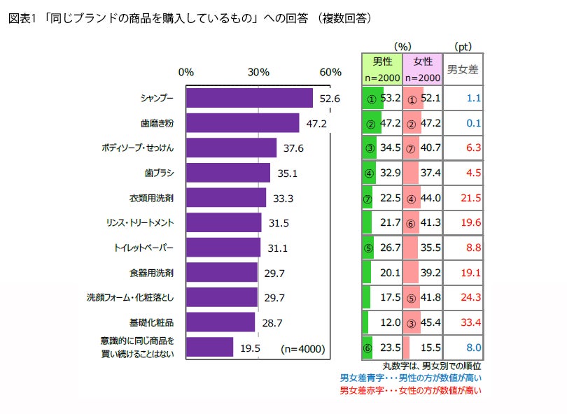 日用品や化粧品への“こだわり”の現れのひとつとして、同じブランドの商品を買うことがあるでしょう。そこで、品目別に同じブランドの商品を購入しているかを聞いてみました(図表1)。52.6%と半数以上が挙げたのが「シャンプー」、これに5.4ポイント差で「歯磨き粉」が続き、「ボディソープ・せっけん」「歯ブラシ」「衣類用洗剤」は3分の1以上にのぼりました。これを男女別にみると、「シャンプー」「歯磨き粉」がともに1・2位で比率もほぼ同程度ですが、3位以下に大きな差が。男性では全体と同じく「ボディソープ・せっけん」「歯ブラシ」が3、4位で、5位に「トイレットペーパー」がランクインしています。対して女性は、全体10位の「基礎化粧品」が3位、これに「衣類用洗剤」「洗顔フォーム・化粧落とし」「リンス・トリートメント」「ボディソープ・せっけん」が続きました。比率の面でも、女性は7位までの品目で4割を超える一方で、男性は2位までとなっており、女性の方が日用品や化粧品にこだわりを持っていると言えそうです。同じブランドの商品を購入する理由としては(図表非掲示)、トップは「気に入っているから」53.8%で、「価格に納得感があるから」29.9%、「詰め替え用があるから」28.7%、「昔から使っているから」28.2%が続きました。