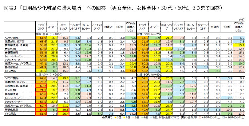 ここからは、日用品・化粧品の購入動向について深掘りしていきましょう。まず、品目別に主な購入場所を3つまで回答してもらった結果が図表3です。メイク用品を除く全品目でトップとなったのは「ドラッグストア」。品ぞろえや価格面からも「日用品を買うなら、やはりここ」と考えている人が多いようです。紙類(トイレットペーパー等)や食品用洗剤は「スーパー」を利用する人も4分の1強いました。日用品や化粧品の買い物頻度が高い女性では、洗剤類は「ドラッグストア」、化粧品類は「ドラッグストア」「ネットショップ」が全体に比べて高い傾向がみられました。