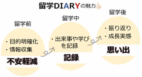 留学DIARYは、留学前には不安軽減、留学中は記録、留学後は思い出として、3つのステージで留学生の気持ちに寄り添います。