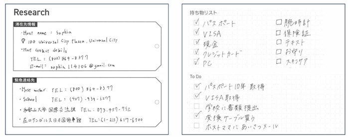 滞在先情報 学校情報 交通情報 緊急連絡先 持ち物リスト TODO 行きたい場所 やりたいことTOP5 現地のマナー 店舗情報 現地で作りたいMyレシピ 留学前の不安 今回の留学での目標 今回の留学先 今回の留学の振り返り