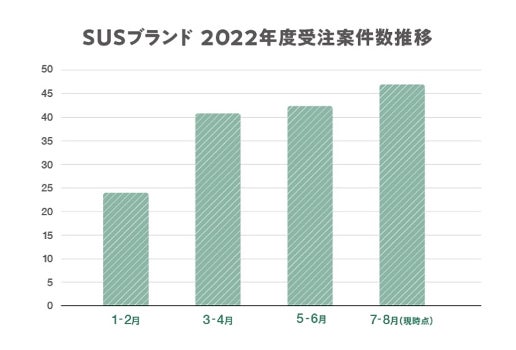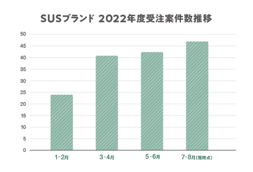 SUSブランドのリリースから約1年で、数多くのサステナブルグッズ製作および販売実績を残すことができました。月々のお問い合わせ件数は徐々に増加しており、企業はもちろん、一般消費者のSDGsの取り組みやエシカル消費に対する意識も高まりつつある手応えを感じています。