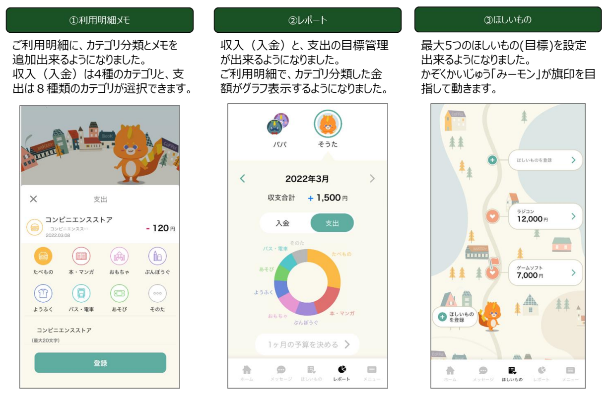 2022年4月には成人年齢引下げや、高等学校での学習指導要領の改訂なども控えており、若年層への金融教育の必要性がより一層増しております。今回のアップデートでは、利用明細を見やすくし、支出管理がより分かり易くなりました。また、目標設定機能の追加により、「貯める喜び」が実感いただけるようになりました。子どもたちのキャッシュレスライフ充実のため、ぜひ、この際に、お申し込みください。