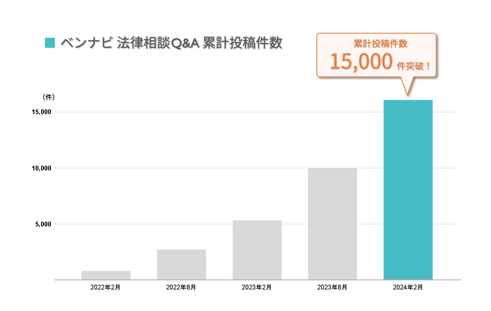 2021年9月に「ベンナビ」に“無料法律相談Q&A”を実装して以降、投稿件数が伸び、2024年2月には累計投稿件数が15,000件を突破いたしました。