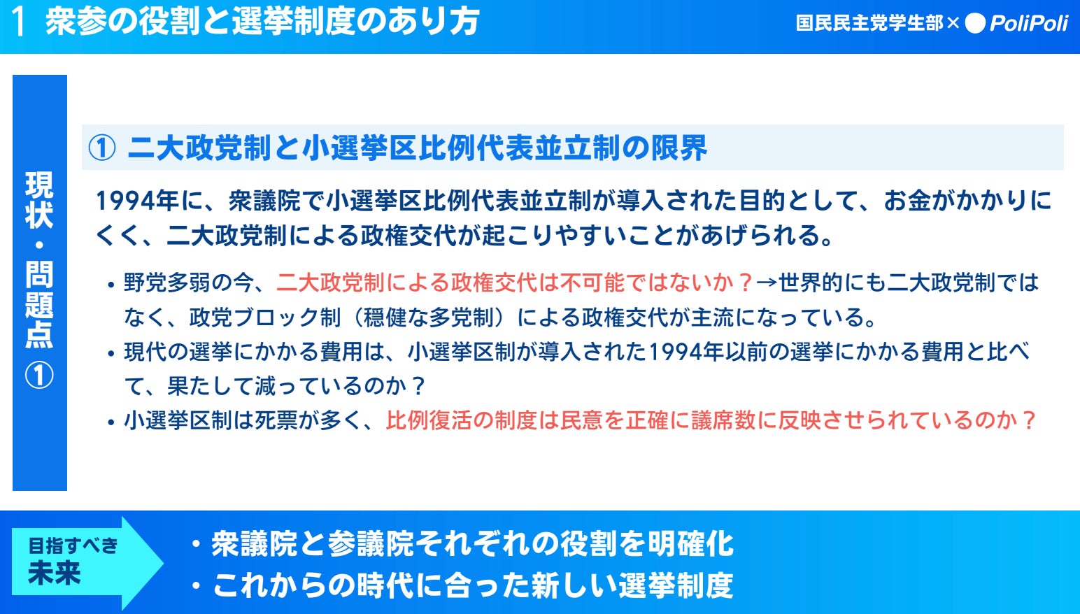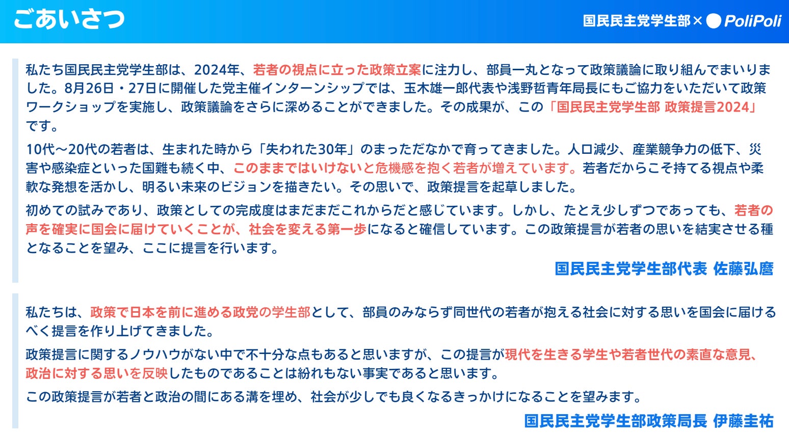 株式会社PoliPoli(所在地:東京都千代田区、代表取締役:伊藤和真、以下 PoliPoli)は、国民民主党学生部が初めて作成する政策提言について、党主催インターンシップに参加しアドバイスを行うなど、約1ヶ月半に渡りサポートをいたしました。