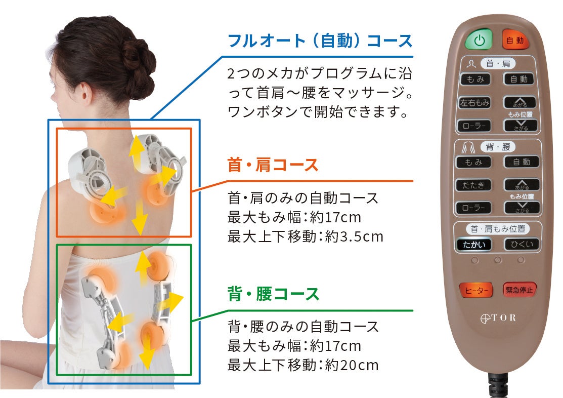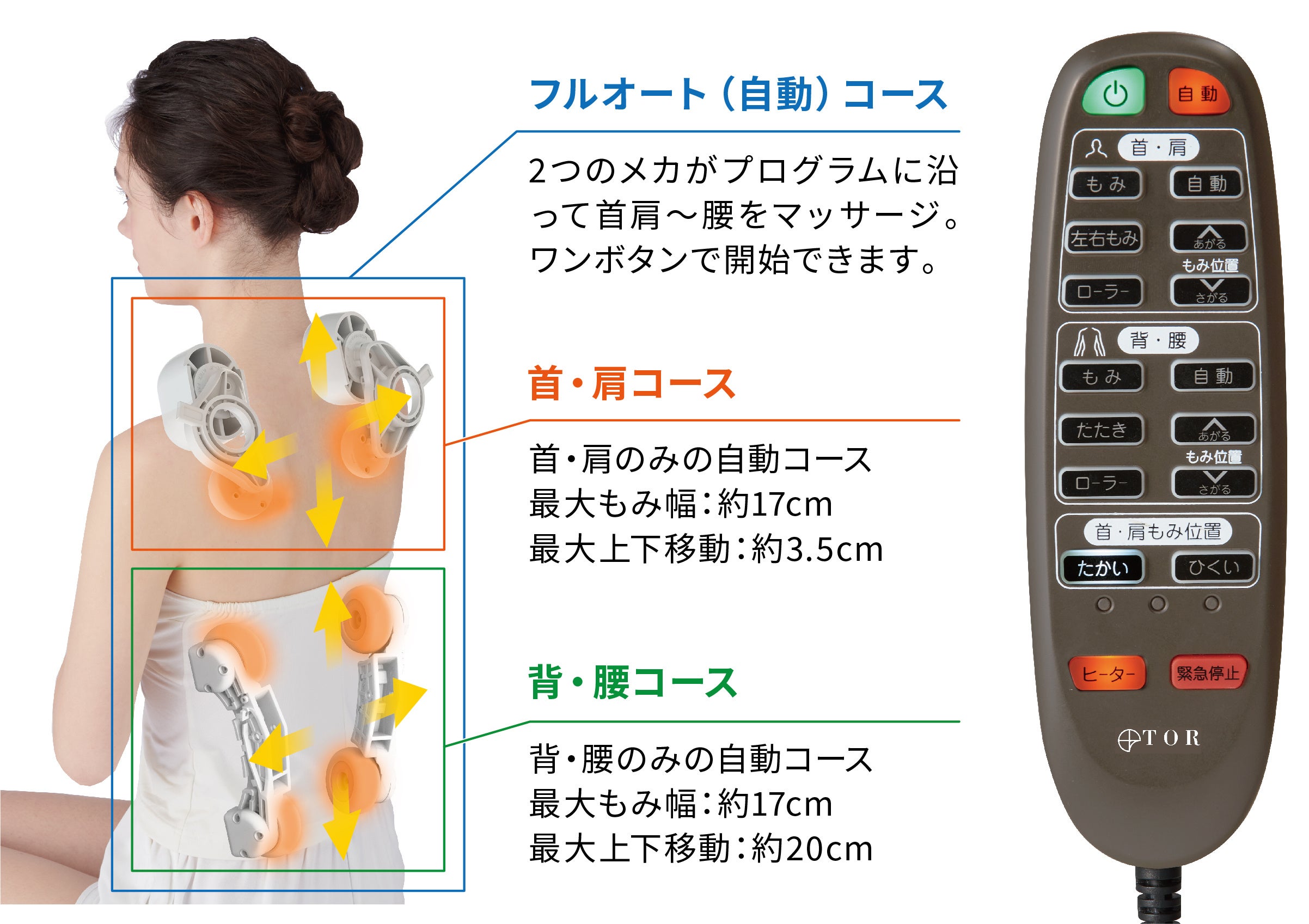 首から腰まで全てを自動でマッサージするフルオートコースと、首・肩と背中・腰それぞれを集中的にマッサージする自動コースを搭載しています。マニュアル設定では、「背中・腰をたたきマッサージする」など、部位を特定してマッサージすることができ、もみ玉の上下位置を調節することもできます。もみ玉はヒーター付きで温めながらマッサージできます。
