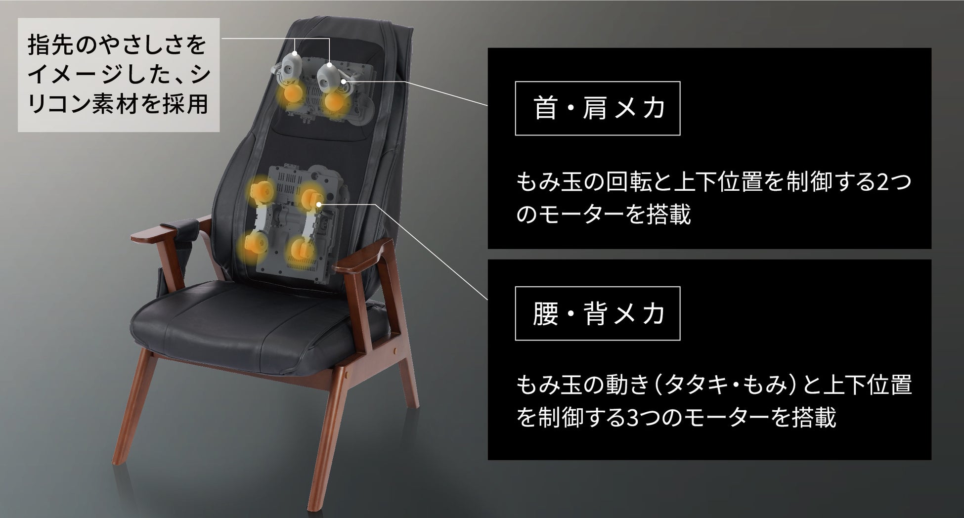 首・肩に2つのモーター、腰・背中に3つのモーターを使用し、ダブルメカを搭載しています。合計5つのモーターシステムが「もみ」「たたき」「ローラー」など、多彩な動きでコリをほぐします。