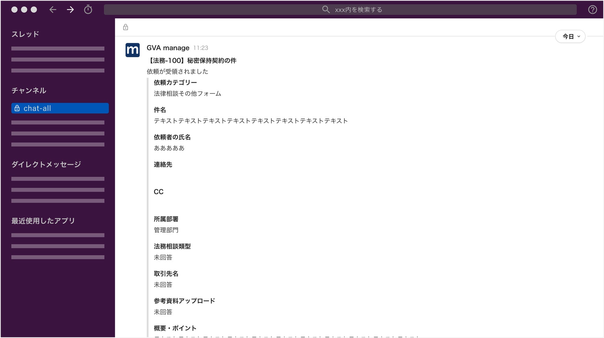 これまでのGVA manageでは、Slackとの連携により、事業部と法務部のやりとりの通知が個人ごとのSlackアプリ上で通知されていましたが、事業部側では自身が所属するチーム全体で依頼状況を把握したいというニーズがありました。
