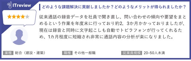 「トビラフォン Cloud」は「ITreview」で平均顧客満足度4.3を獲得しています(2025年7月16日時点 85レビュー)。当製品のご利用者様から実際に寄せられたレビューを一部ご紹介します。