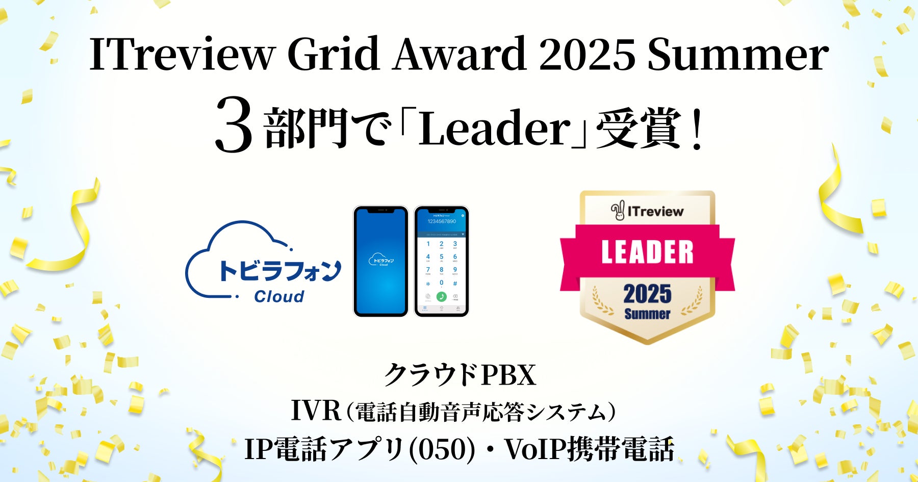 トビラフォン Cloud、「ITreview Grid Award 2025 Summer」のクラウドPBX、IVR、IP電話アプリ(050)・VoIP携帯電話の3部門で「Leader」を受賞