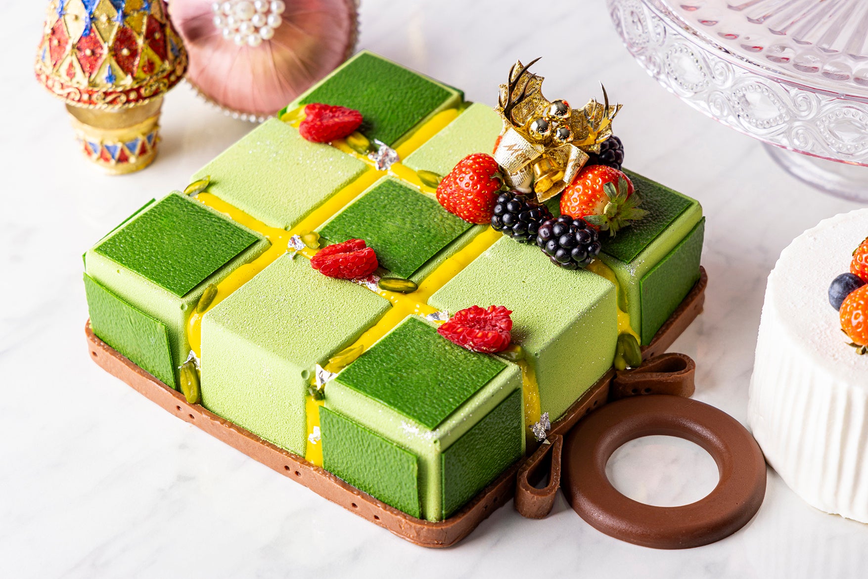 ライム風味のホワイトチョコレートムースの中にはピスタチオのババロア、ピスタチオのビスキュイとピスタチオのキャラメリゼを忍ばせました。ナッティーなピスタチオの風味とラズベリーのゼリーやライムの香りが爽やかな味わいです。色違いのキューブ風アレンジがキュートなグリーンのキャリーバッグをイメージしたクリスマスケーキ。