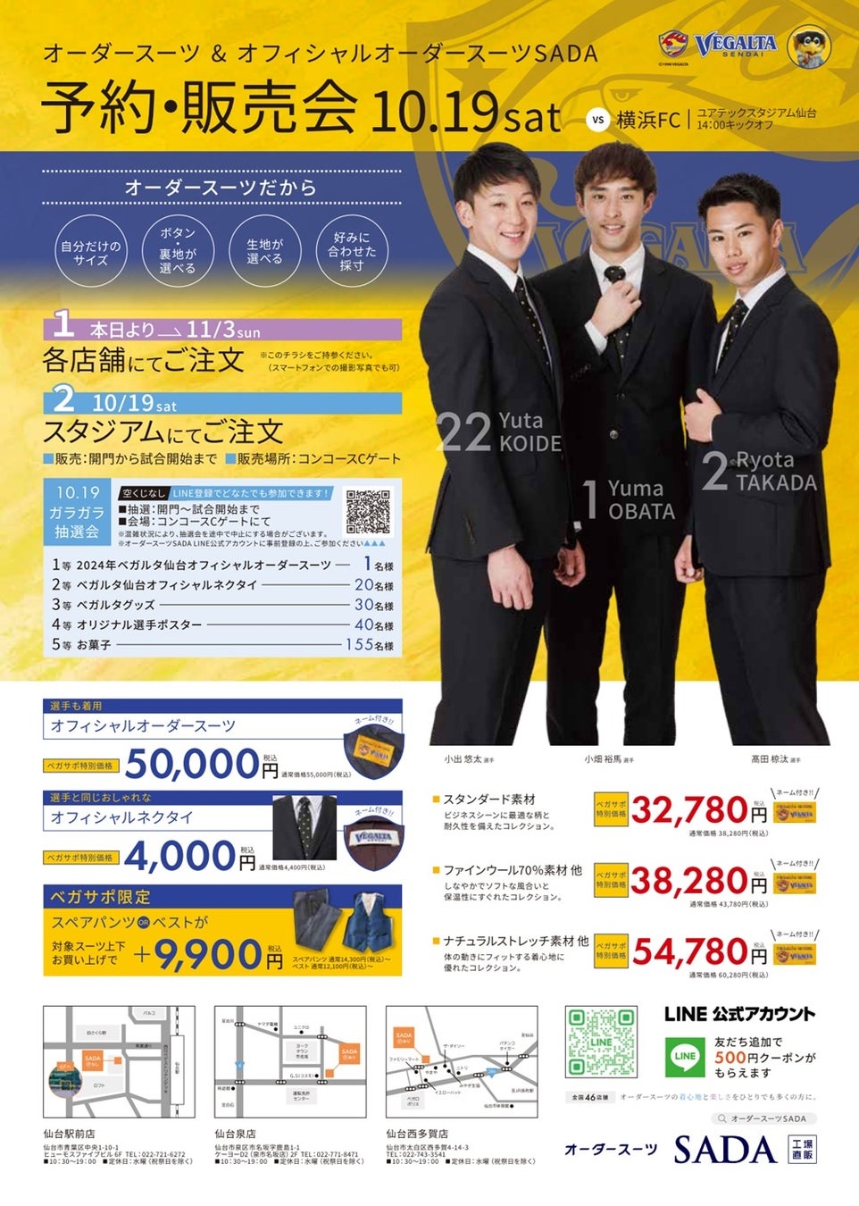 「ベガルタ仙台」オフィシャルスーツサプライヤー オーダースーツSADAオフィシャルスーツスタジアム予約販売会10月19日(日)開催