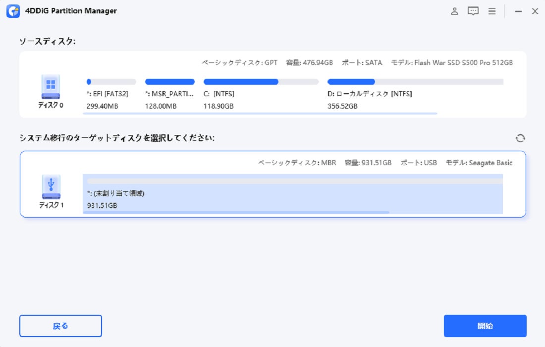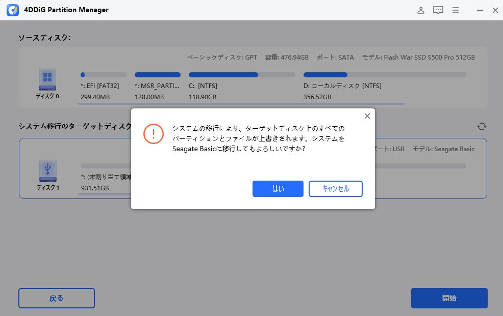 ステップ2.ソースディスクを選択した後、移行先のターゲットディスクを選択します (現在動作しているOSが既定で選択されます)。いくつかの警告メッセージが送信されます。それらを読んだ後、「はい」をクリックしてください。システム移行プロセスを開始するには、「開始」をクリックします。