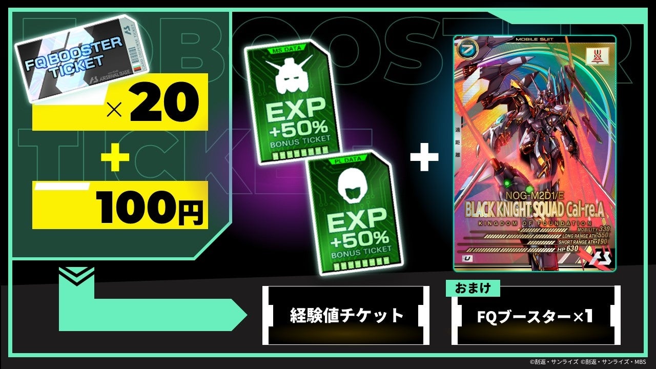 「FQブースターチケット」を20枚消費+100円投入で、経験値チケットをゲットでき、追加カード「FQブースター」を入手できます。