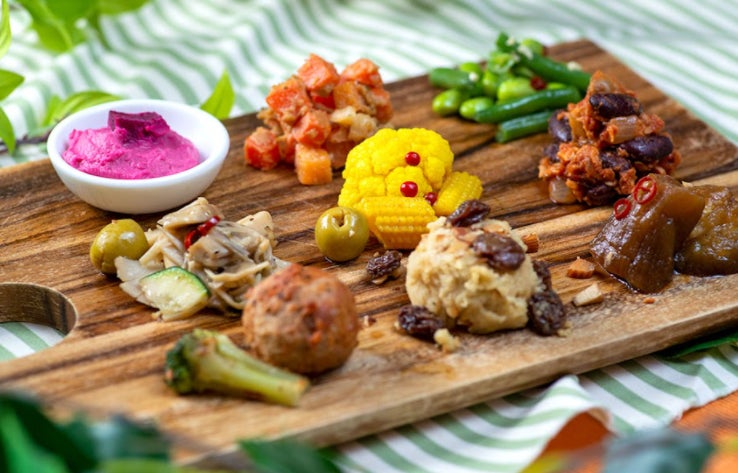 ヴィーガンメニューの定番、ひよこ豆のフムスをビーツで色鮮やかなピンク色に仕上げました。