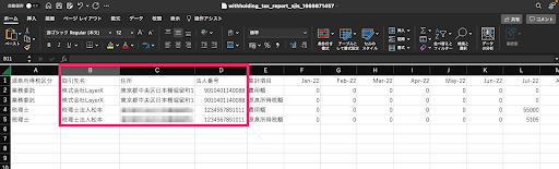 源泉所得税レポートで、取引先別・支払月別の費用額・源泉所得税額に加えて、新たに取引先別の住所・法人番号も出力できるようになりました。