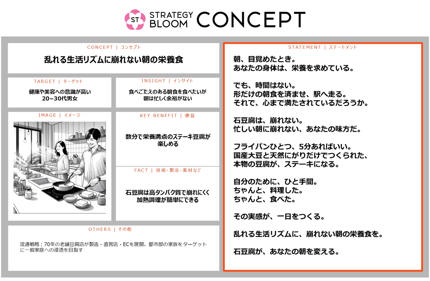 戦略と表現の一貫性担保:コンセプト開発によって作り出したブリーフシートをベースに文章化するため、ステートメント制作のの過程で生じがちな「戦略のズレ」を抑え、マーケティング戦略の狙いを確実に具現化します。