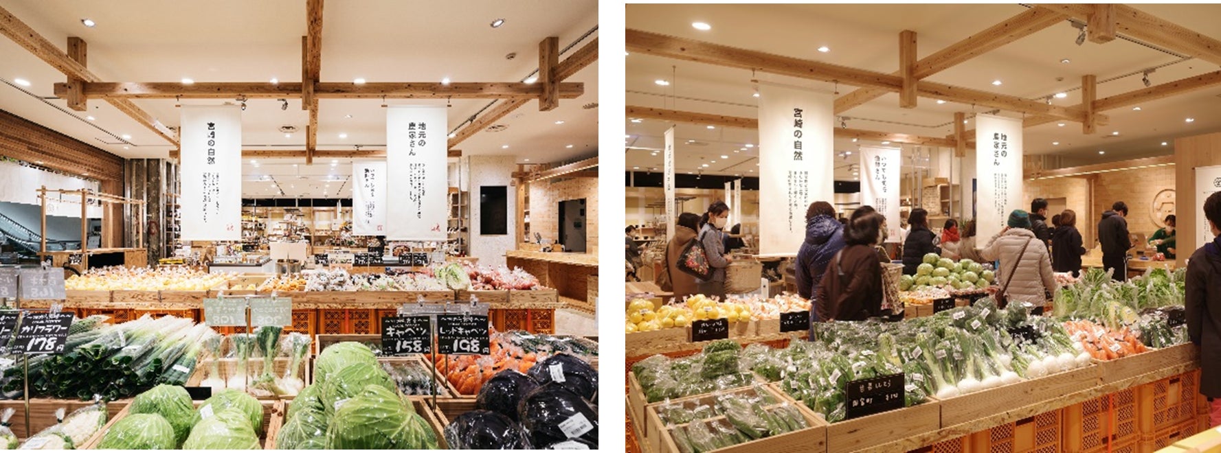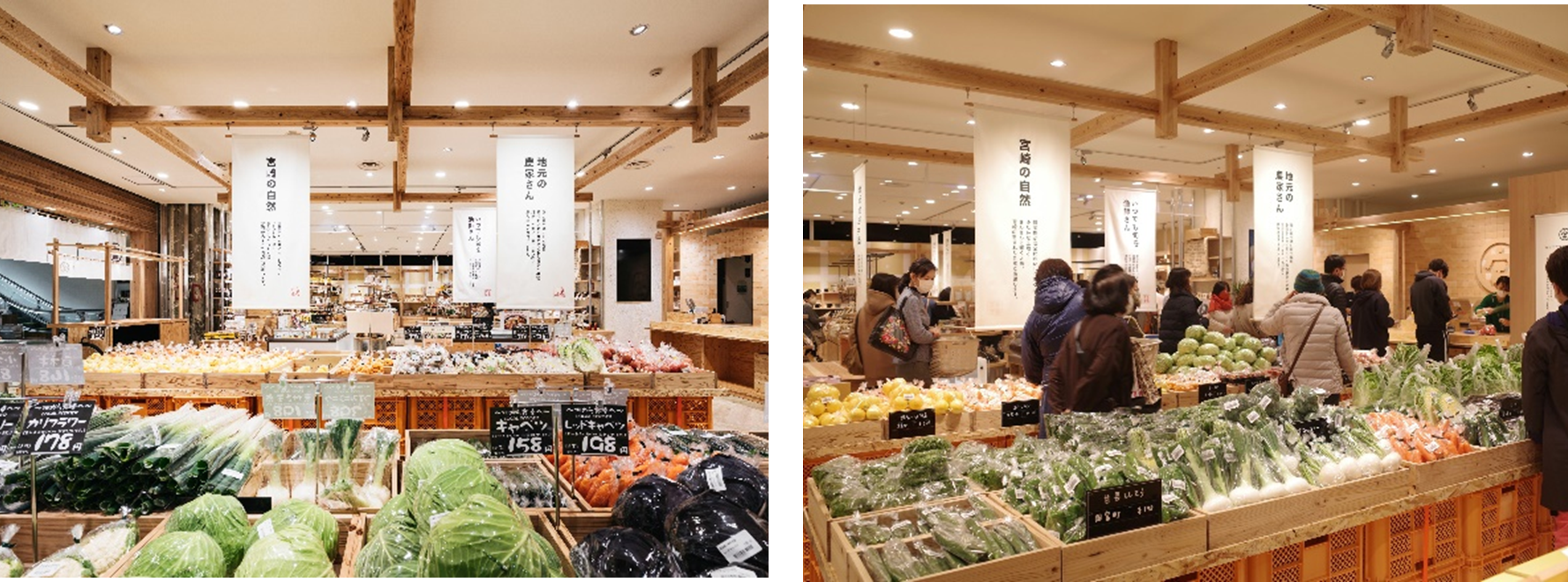 有機農業のまち綾町の有機野菜をはじめ県内の新鮮な野菜、農林水産省および宮崎県が推進する、地域食品産業連携プロジェクト「ローカルフードプロジェクト」(以下、LFPという。)での開発商品やMIYAZAKI FOOD AWARD受賞商品などの県内の豊富な食資源を活用してつくられた加工品などをご用意しております。