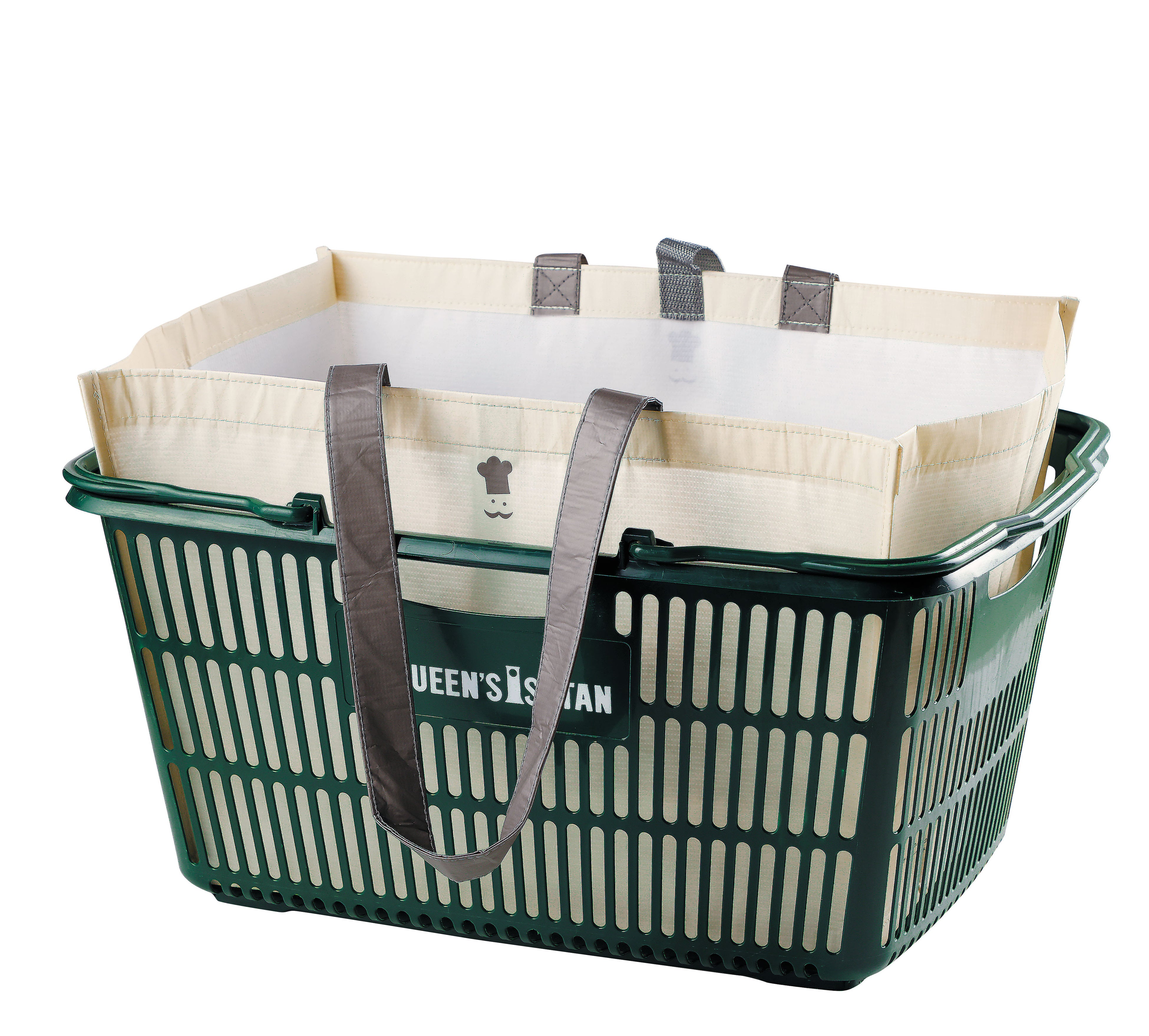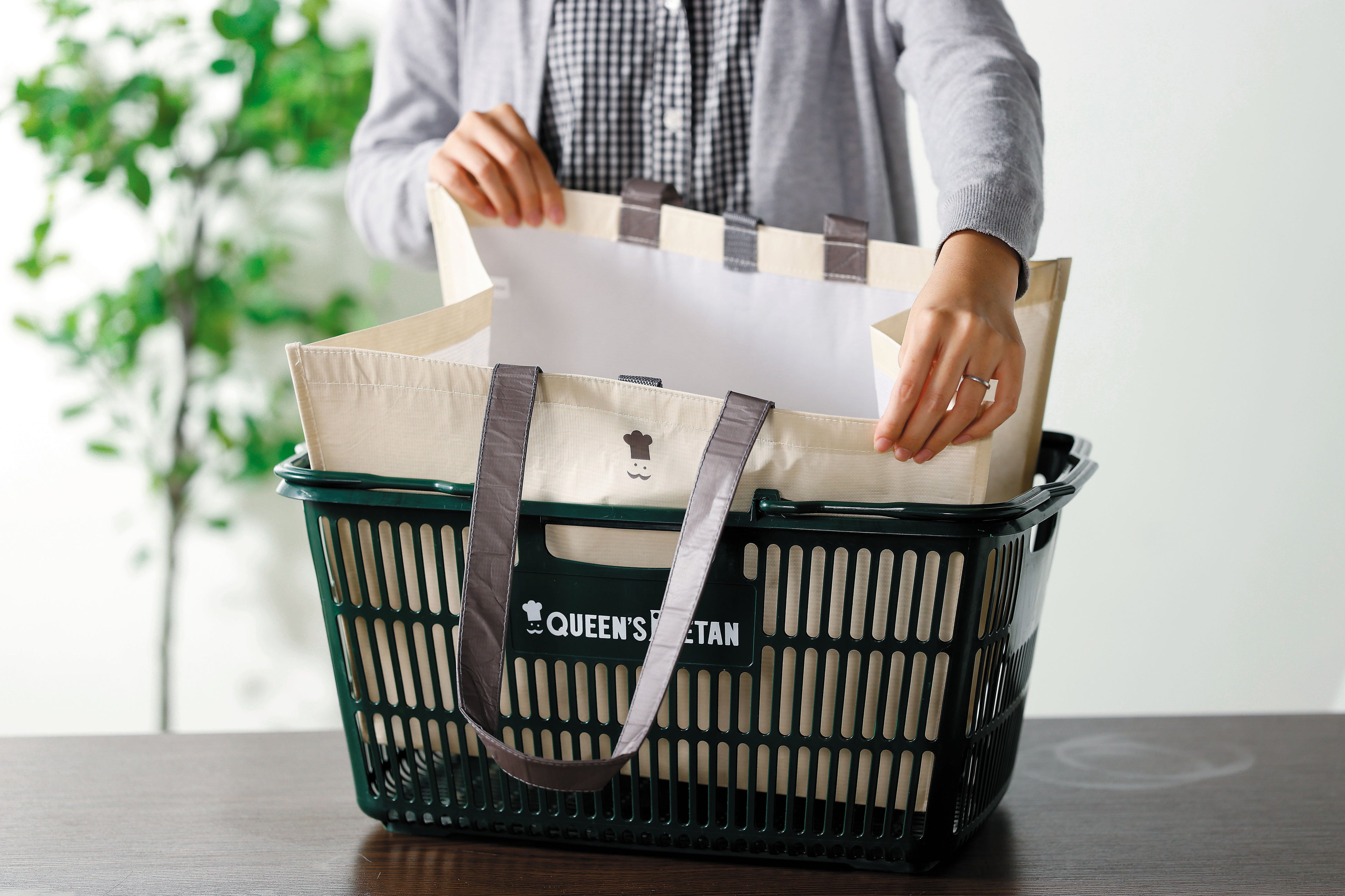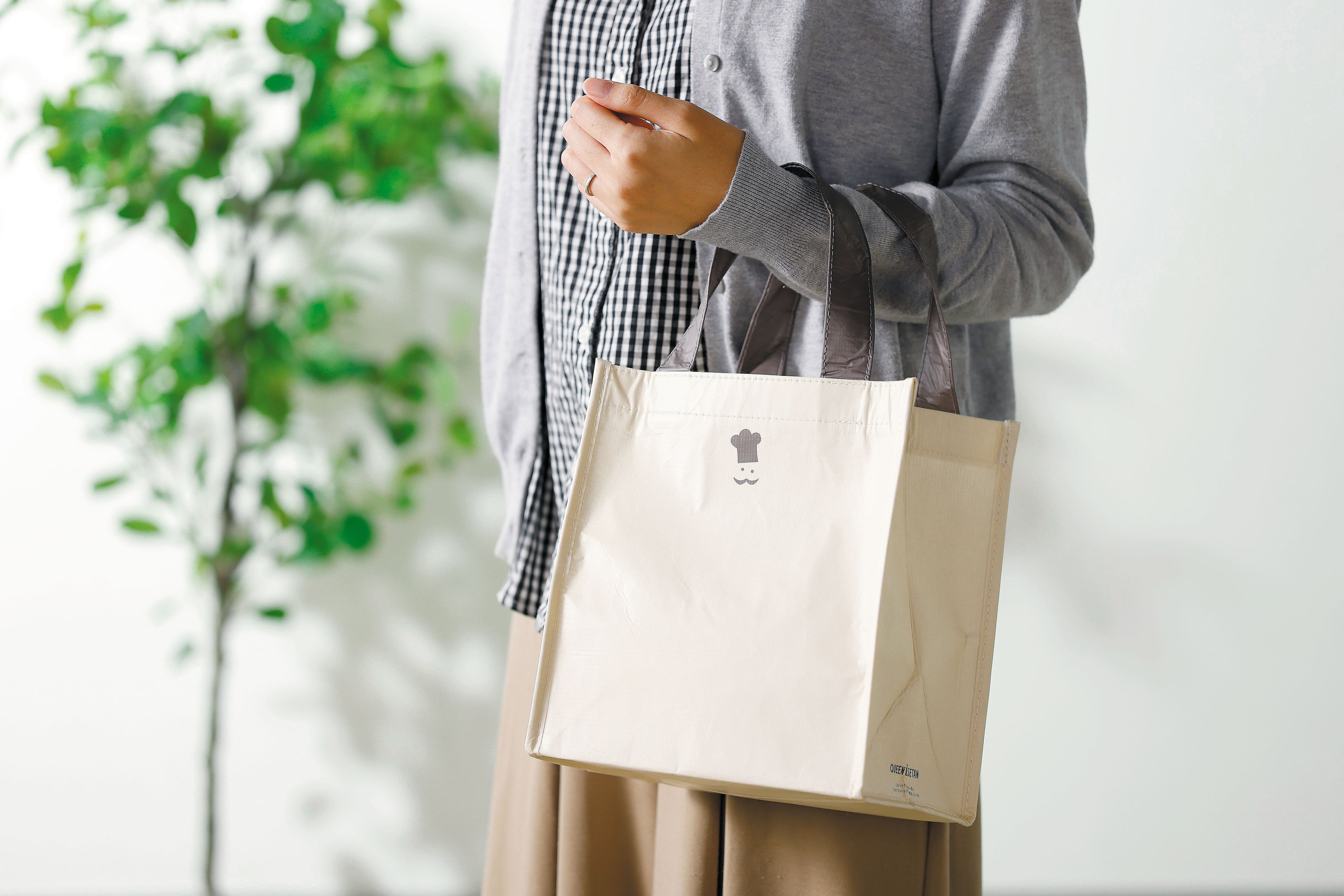 どのサイズもマチが広いので、お肉や魚などのトレーのものや幅のある商品も横にならず、入れることができます。材質はポリエステル素材なので、ちょっとした雨にも対応できます。色は「ナチュラル」「自然」をイメージし、上品で落ち着きのある、普段の生活になじみやすい色のベージュを基調としています。さりげなくワンポイントでクイーンズ伊勢丹のシンボルマークである、シェフマークを入れました。