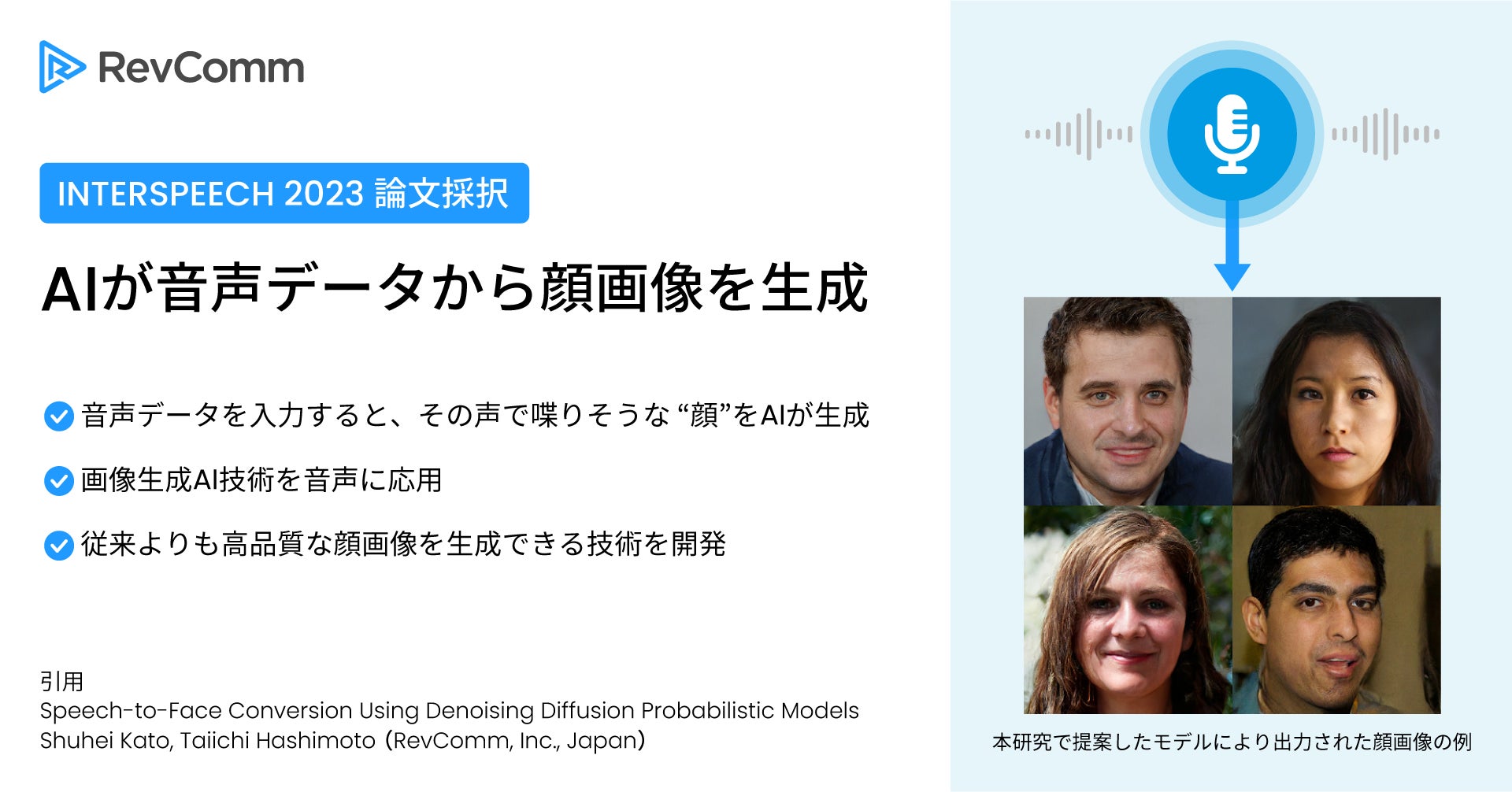 RCRの研究の成果として、シニアリサーチエンジニアの加藤集平、リサーチディレクターの橋本泰一が、入力音声に適した顔画像の生成(音声−顔変換)に関する論文「Speech-to-Face Conversion Using Denoising Diffusion Probabilistic Models」を「INTERSPEECH2023」に投稿し、採択されました。レブコムは、筑波大学や京都大学との共同研究の成果として、INTERSPEECHに論文を採択されたことがありますが、レブコム単著としては今回が初の採択となります。
