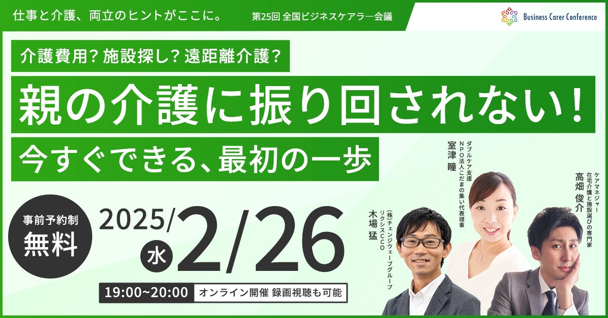 2月26日(水)現役ビジネスパーソンと各分野のプロが結集するオンラインセミナー『全国ビジネスケアラー会議 仕事と介護、両立のヒントがここに。』開催のお知らせ