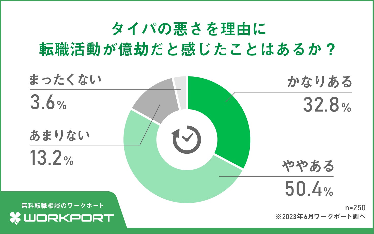 続いて、転職活動でタイパの悪さを感じる場面があると回答した人に、タイパの悪さを理由に転職活動が億劫だと感じたことはあるか聞いたところ、「かなりある」(32.8%)、「ややある」(50.4%)が合わせて83.2%と8割を超える結果となりました。大多数の人にとって、タイパの悪さは転職活動のモチベーション低下に直結することがわかりました。