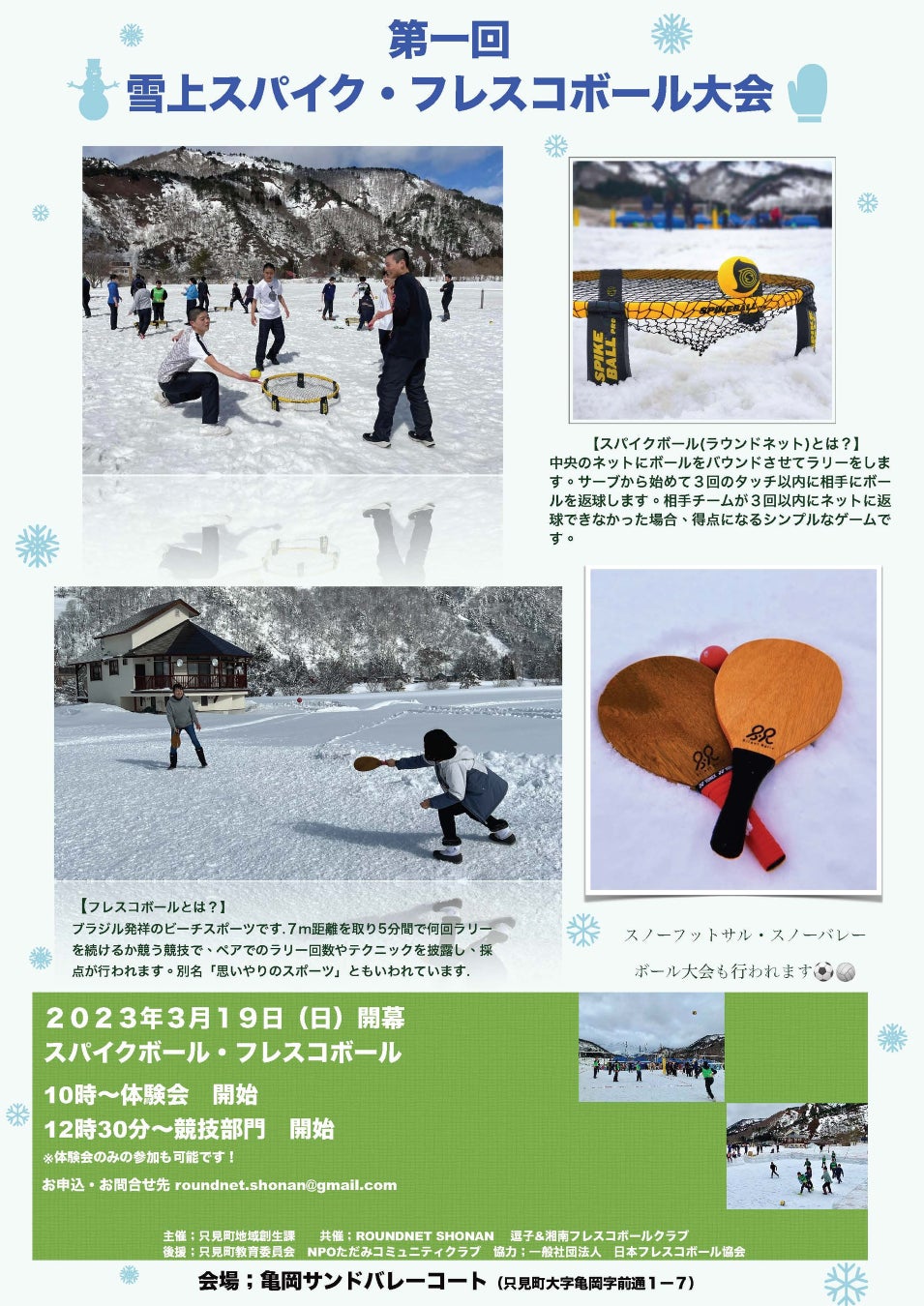 神奈川県で活動するJFBA公認地域クラブ「逗子フレスコボールクラブ」と「湘南鵠沼フレスコボールクラブ」が、福島県只見町とコラボ。白銀の世界を舞台に『第一回雪上スパイク・フレスコボール大会』を共催することが決定いたしました。主催は只見町地域創生課で、両クラブに加えてROUNDNET SHONANが共催団体となります。