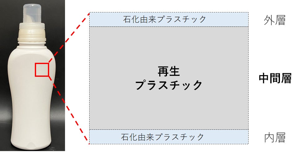 さらに、市場から回収した包装資材を元材料とする再生プラスチックを活用するにあたり、当社日用品での使用実績がない材料であることから、手が触れる外層部と内用液が触れる内層部には石化由来プラスチックを活用し、中間層に今回開発した再生プラスチックを挟む3層構造とすることで、従来品と同等の品質を確保しました(図1)。