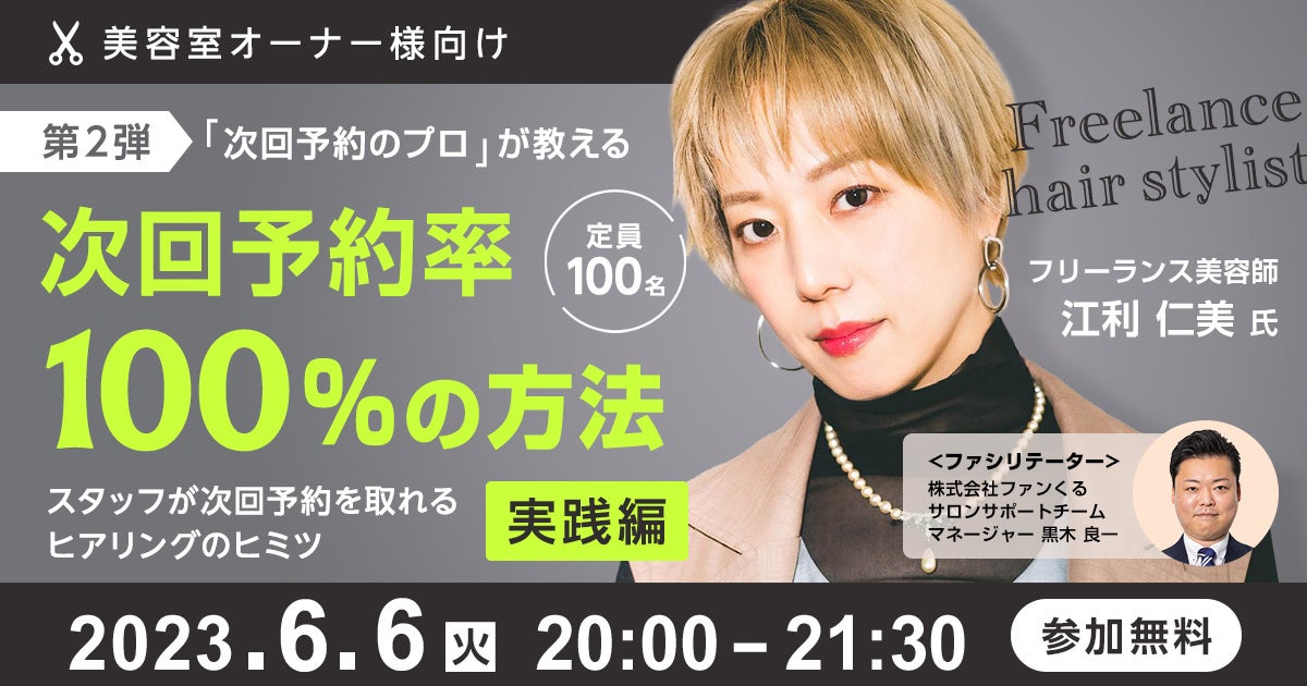 今年3月に開催した株式会社ファンくるとフリーランス美容師で次回予約のプロの江利仁美さんの共催ウェビナーの申し込みは200名を超え、大好評でした。今回は「次回予約98%の理由」第2弾としてお送りします。
