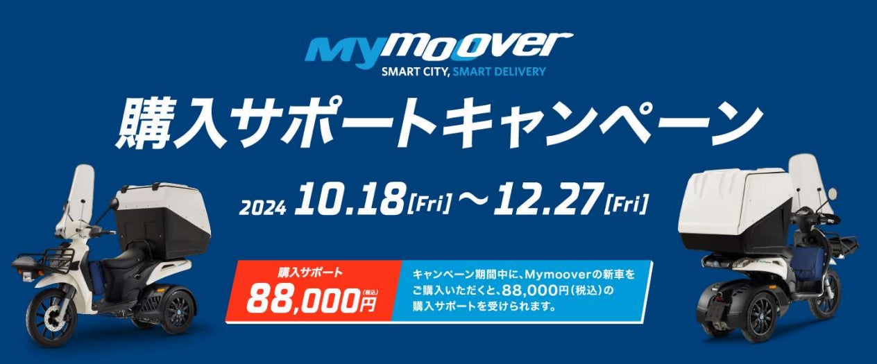 3 つの 車輪と傾斜する後部の大型トランクを装備し、より優しく安心な走行性能と、高い積載力を有する 3 輪の原付二 種スクーター『ピアッジオ Mymoover(マイムーバー)』ご購入者に、88,000 円の購入資金をサポートするキャンペ ーンを、全国のピアッジオ・ベスパ正規販売店にて 2024 年 10 月 18 日(金)から 12 月 27 日(金)まで実施いたします。