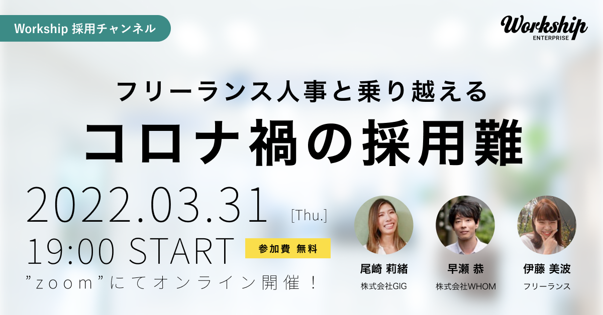 フリーランス・副業向けマッチングサービス『Workship(https://goworkship.com/)』を運営する株式会社GIGは、「【Workship採用チャンネルvol.3】フリーランス人事と乗り越えるコロナ禍の採用難」をテーマに無料ウェビナーを開催いたします。