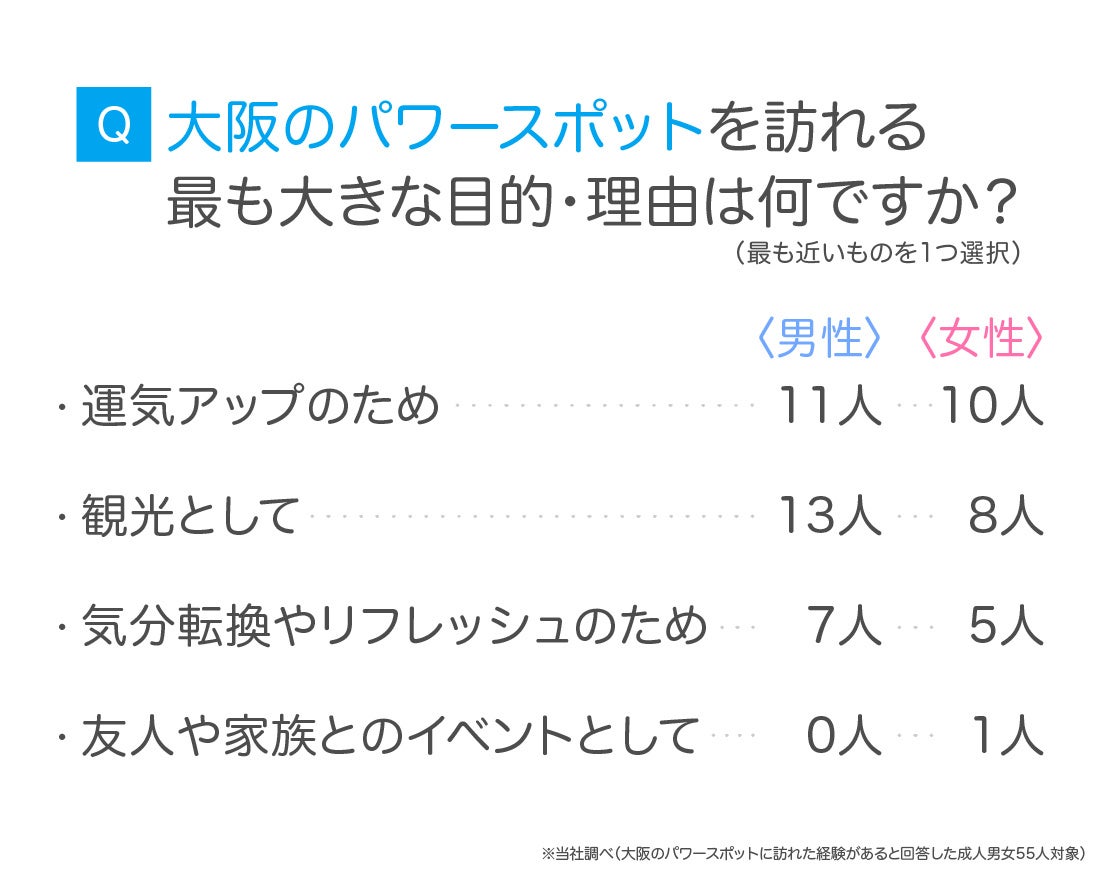 「大阪のパワースポットを訪れた経験がある」と回答した55人に、訪れる最も大きな目的・理由を尋ねたところ、「運気アップのため」「観光として」が同数で最多(各38.2%/21/55)でした。