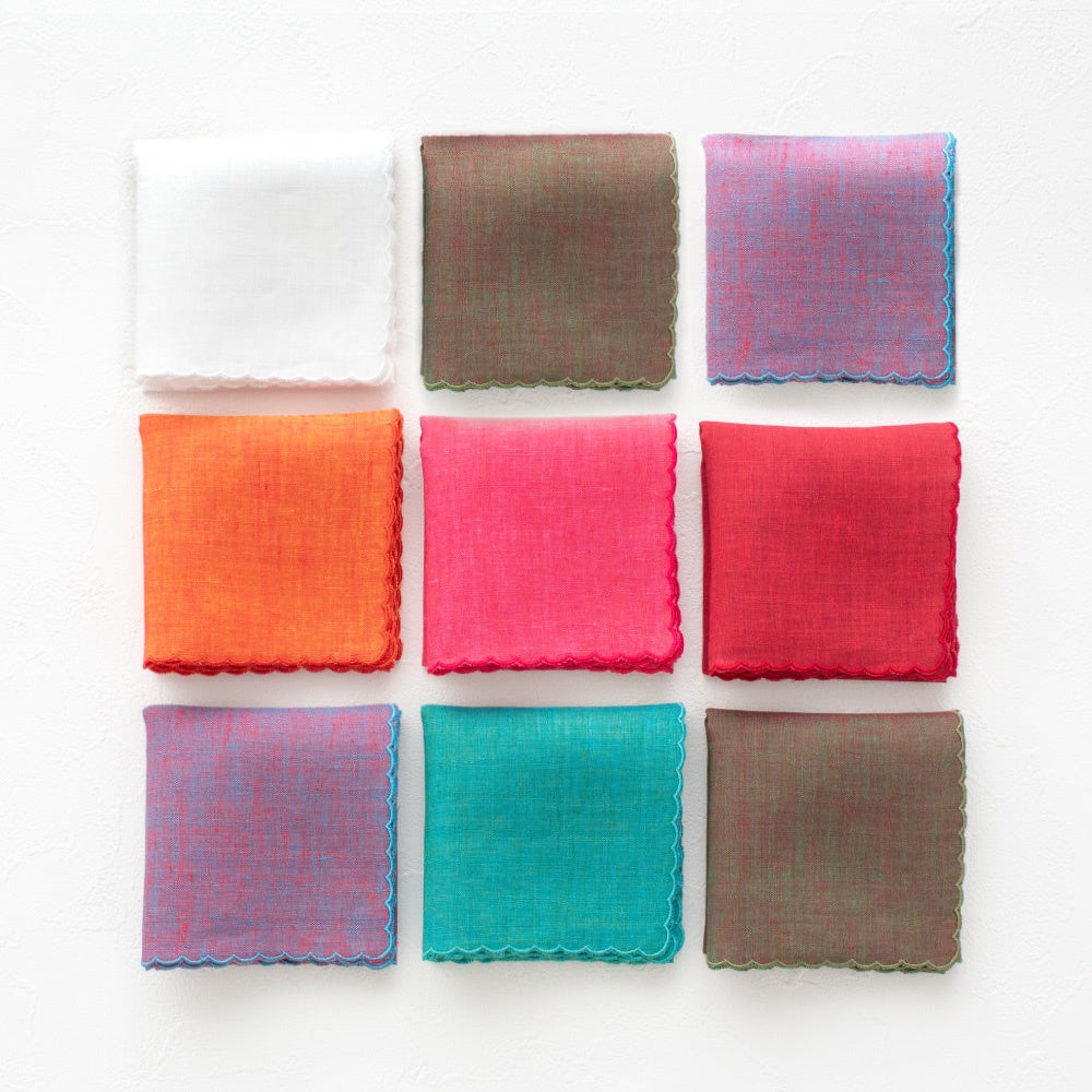 一本一本丁寧に染め上げた麻糸(リネン)で、タテヨコ同じカラーを織り込んだソリッドなタイプや、異なったカラーでシャンブレーに織り上げたものなど、さまざまな色合いと表情のハンカチーフです。吸水性と速乾性に優れたさらりとした触り心地。使えば使いこむほどに柔らかくなり手に馴染むのもリネンハンカチーフの魅力です。