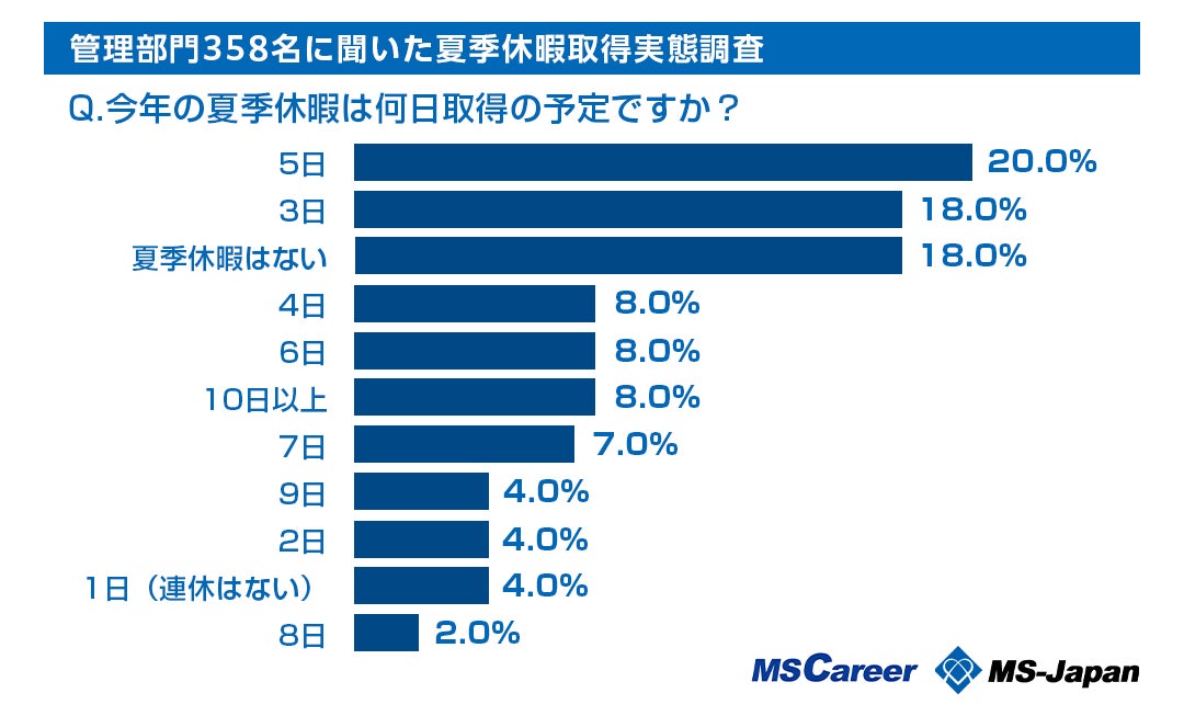 今回の調査では、管理部門で夏季休暇の取得予定がある人は8割で、「夏季休暇がない」方も5人に1人の割合でいることがわかりました。
