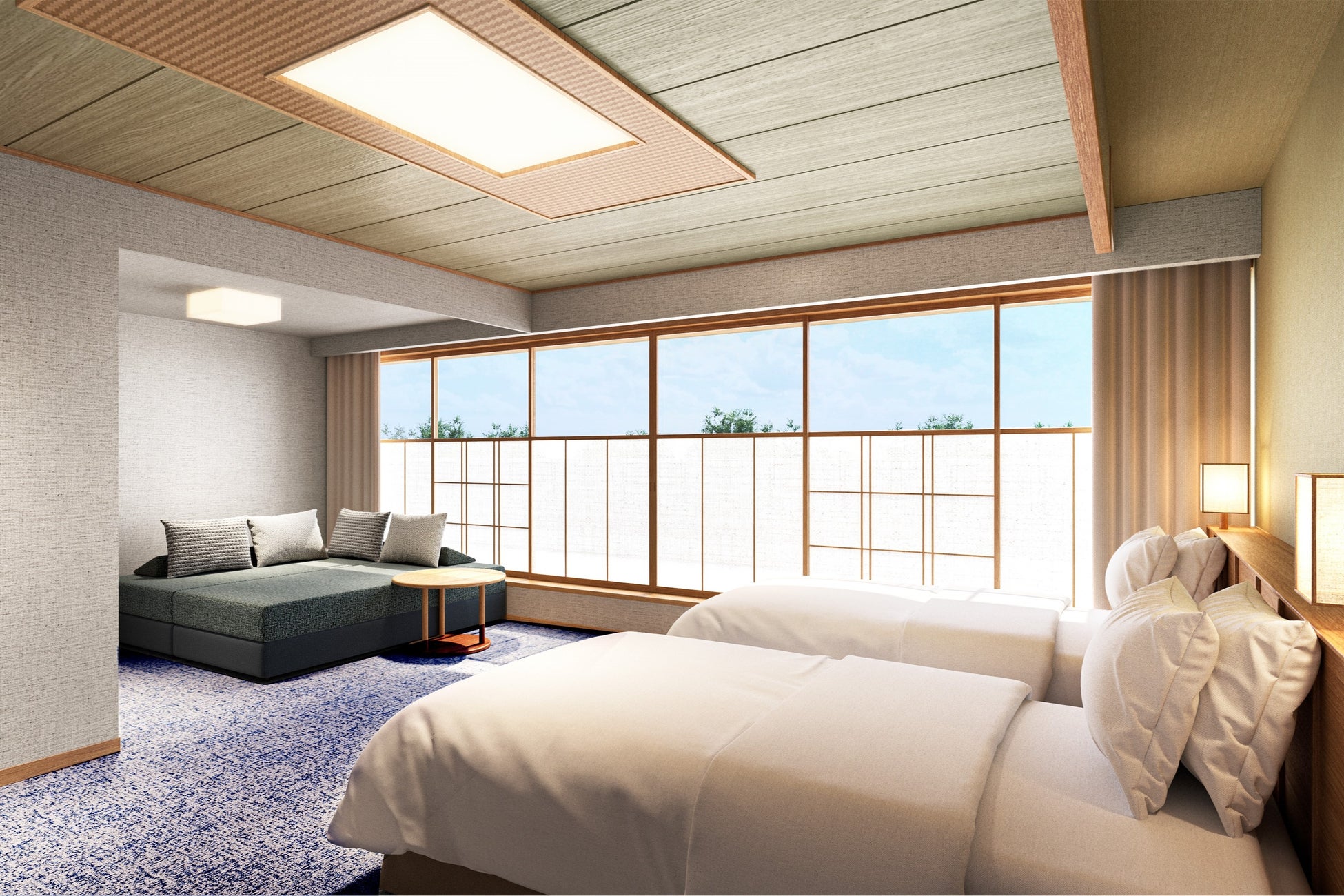 3階の和室12室は、NEMU RESORTらしい木の温もりと自然を感じるグリーンを基調としたデザインの「エグゼクティブ」に、2階の和室19室は、ベッドを備えた「スーペリア」に、それぞれ生まれ変わります。