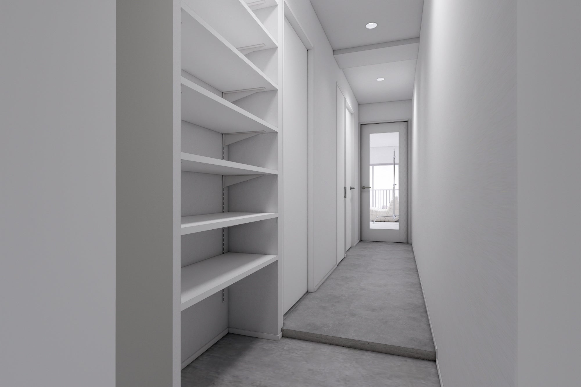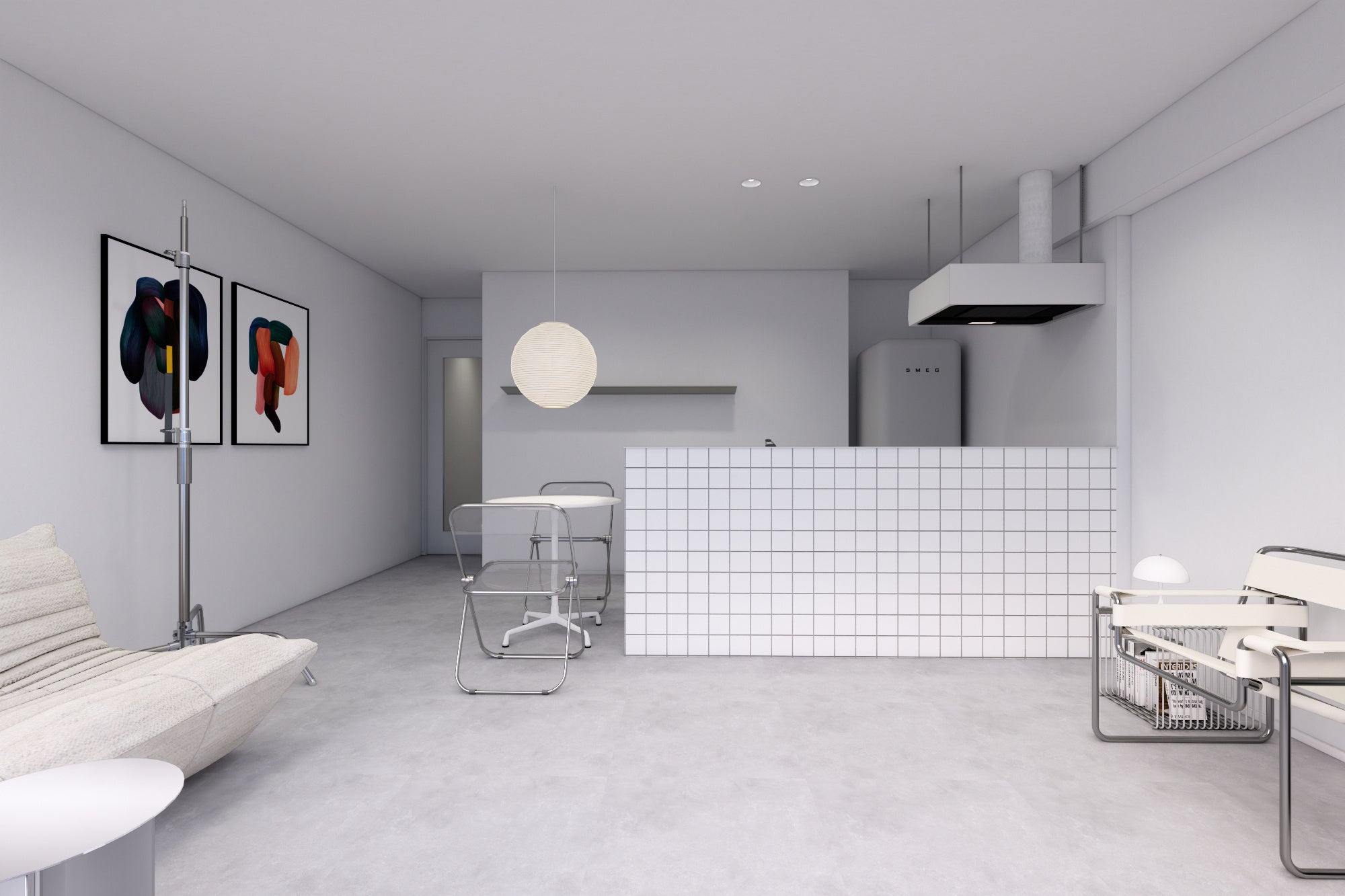 標準仕様として、有機質の象徴である「木」の表情は用いず、クロスは壁から天井まで全て白一色とし、床はLDKから廊下、洋室、水回りまでモルタル調のフロアタイルで統一することで、生活感を抑えた「SNSで目にする」ような洗練された住空間を演出します。